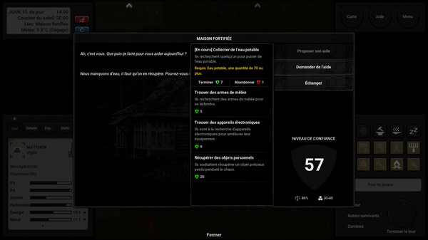 Entretenez votre condition physique pour rester en forme dans cette apocalypse. Survivre n'est pas facile : vous devrez manger, dormir et rester au chaud. Cherchez des matériaux pour fabriquer des outils et des armes, et préparez des repas pour garder votre énergie. Chaque action, de la fabrication d'objets à la cuisine, a un impact direct sur vos chances de survie.